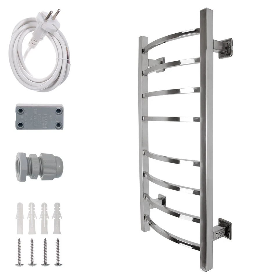 Комплектация: полотенцесушитель на 4 кронштейнах — 1 шт.; электрический шнур (150 см) с вилкой — 1 шт.; муфта переходная для подключения электрического шнура — 1 шт.; уплотнительные прокладки — 4 шт.; шурупы — 8 шт.; дюбели — 8 шт.; инструкция — 1 шт.