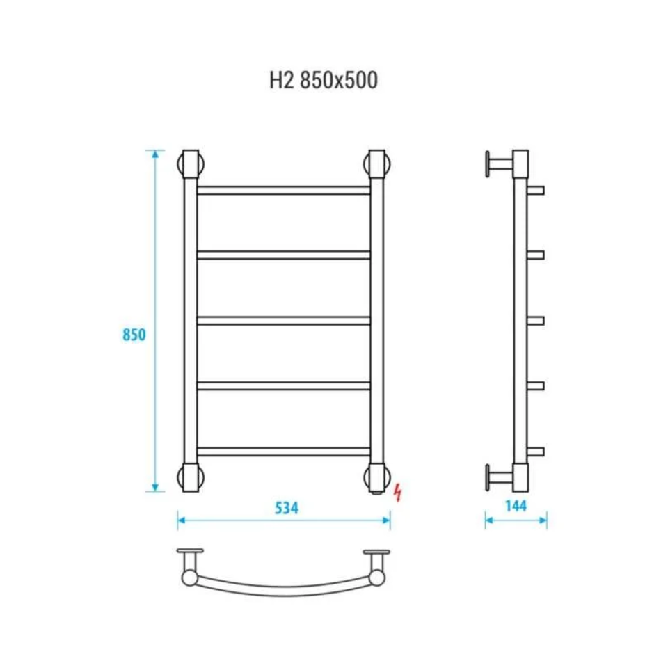 Energy H2 850x500 - электрический полотенцесушитель - лесенка с пятью выпуклыми стационарными перекладинами, равномерно разнесенными по высоте изделия. Выполнен из высококачественной пищевой нержавеющей стали.