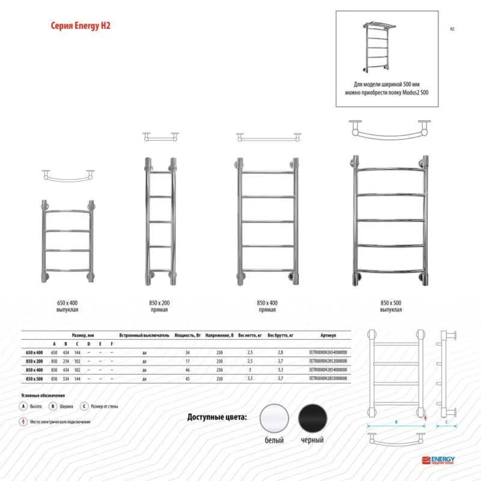 Полотенцесушитель электрический Energy H2 850 х 500, ширина 53.4 см, высота 85 см
