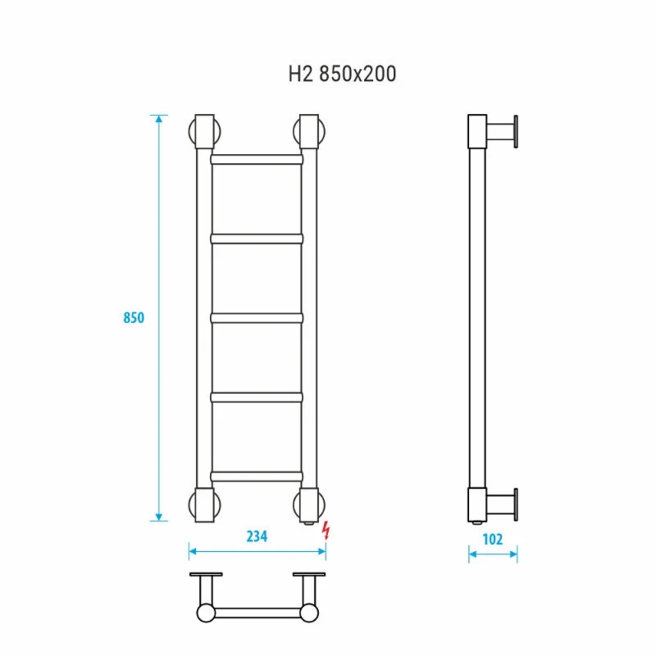 Energy H2 850x200 - электрический полотенцесушитель - лесенка с пятью выпуклыми стационарными перекладинами, равномерно разнесенными по высоте изделия. Выполнен из высококачественной пищевой нержавеющей стали.