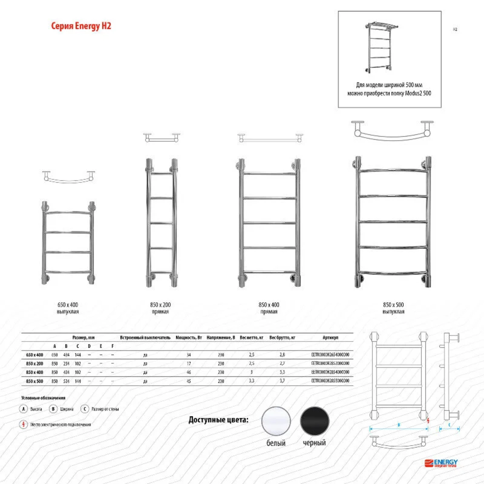 Energy H2 - второе поколение полотенцесушителей Energy H. Новые полотенцесушители отличаются от предыдущих моделей увеличенной на 50 мм высотой и верхними кронштейнами, аналогичными нижним, что обеспечивает простоту установки и симметричность верха и низа полотенцесушителя.