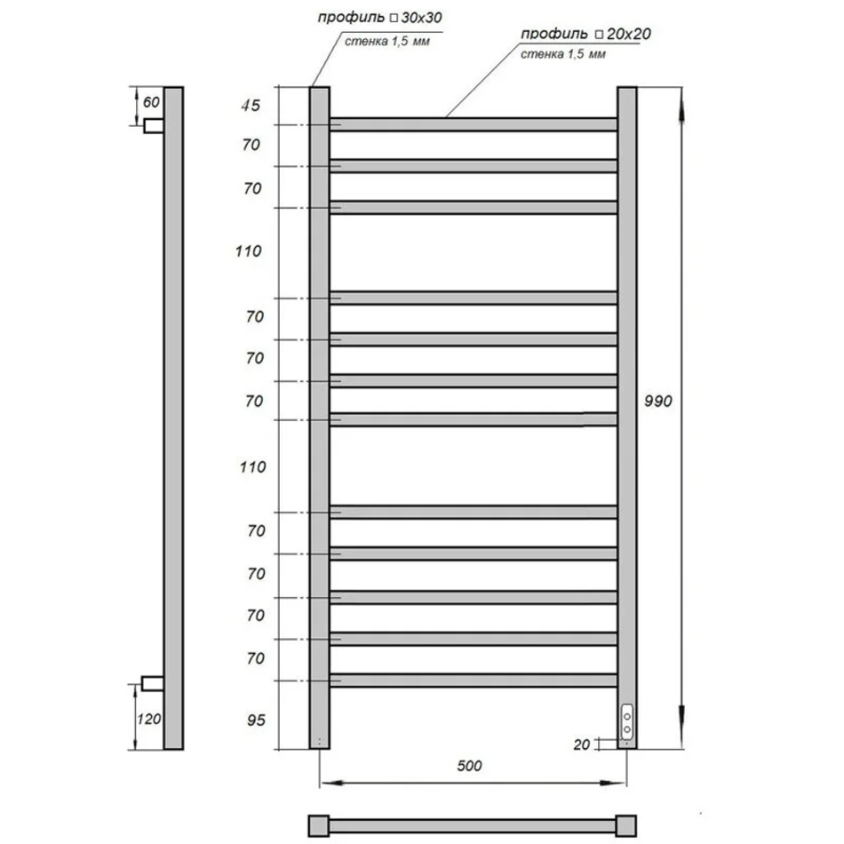 Полотенцесушитель электрический Point Вега, П12, ширина 50 см, высота 100 см, диммер справа, белый, PN71850W