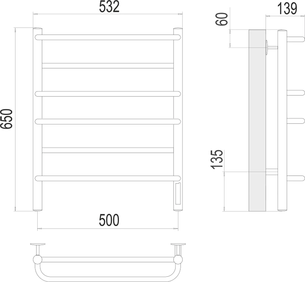 Полотенцесушитель электрический Terminus Евромикс П6 500х650 электро, 4670078531278, ширина 50 см, высота 65 см, диммер справа, цвет нержавеющая сталь