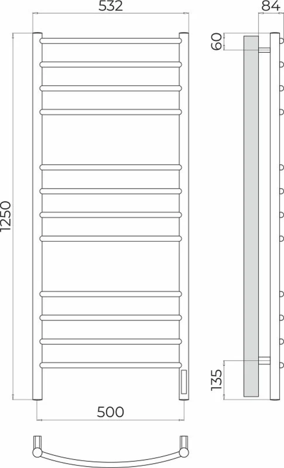 Полотенцесушитель электрический Terminus Классик П12 500х1250 электро, 4670078544476, ширина 50 см, высота 125 см, диммер справа, цвет нержавеющая сталь