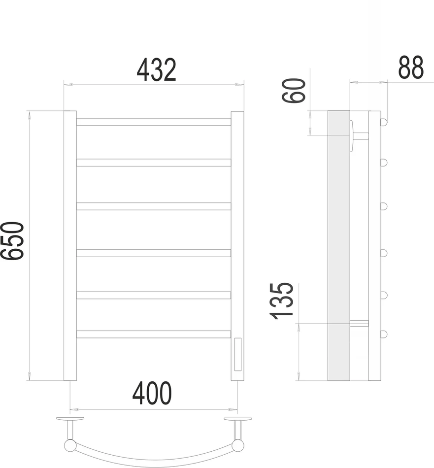 Полотенцесушитель электрический Terminus Классик П6 400х650, ширина 43.2 см, высота 65 см, подключение справа, 4670078531308