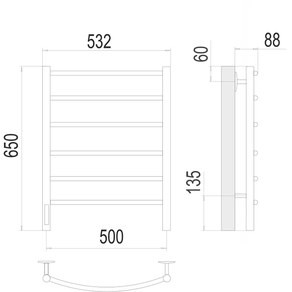 Полотенцесушитель электрический Terminus Классик П6 500х650 электро левый, ширина 53 см, высота 65 см, диммер слева, цвет нержавеющая сталь