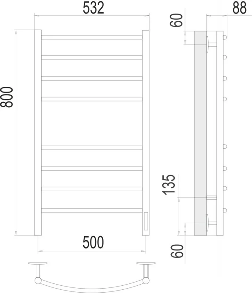 Полотенцесушитель электрический Terminus Классик П8 500х800, ширина 53.2 м, высота 80 см, черный RAL 9005 матовый, 4670078527608