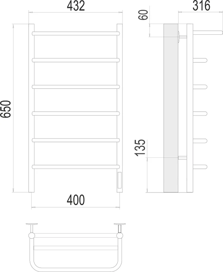 Полотенцесушитель электрический Terminus Полка П6 400х650 электро, 4670078531421, ширина 40 см, высота 65 см, диммер справа, с полкой, цвет нержавеющая сталь