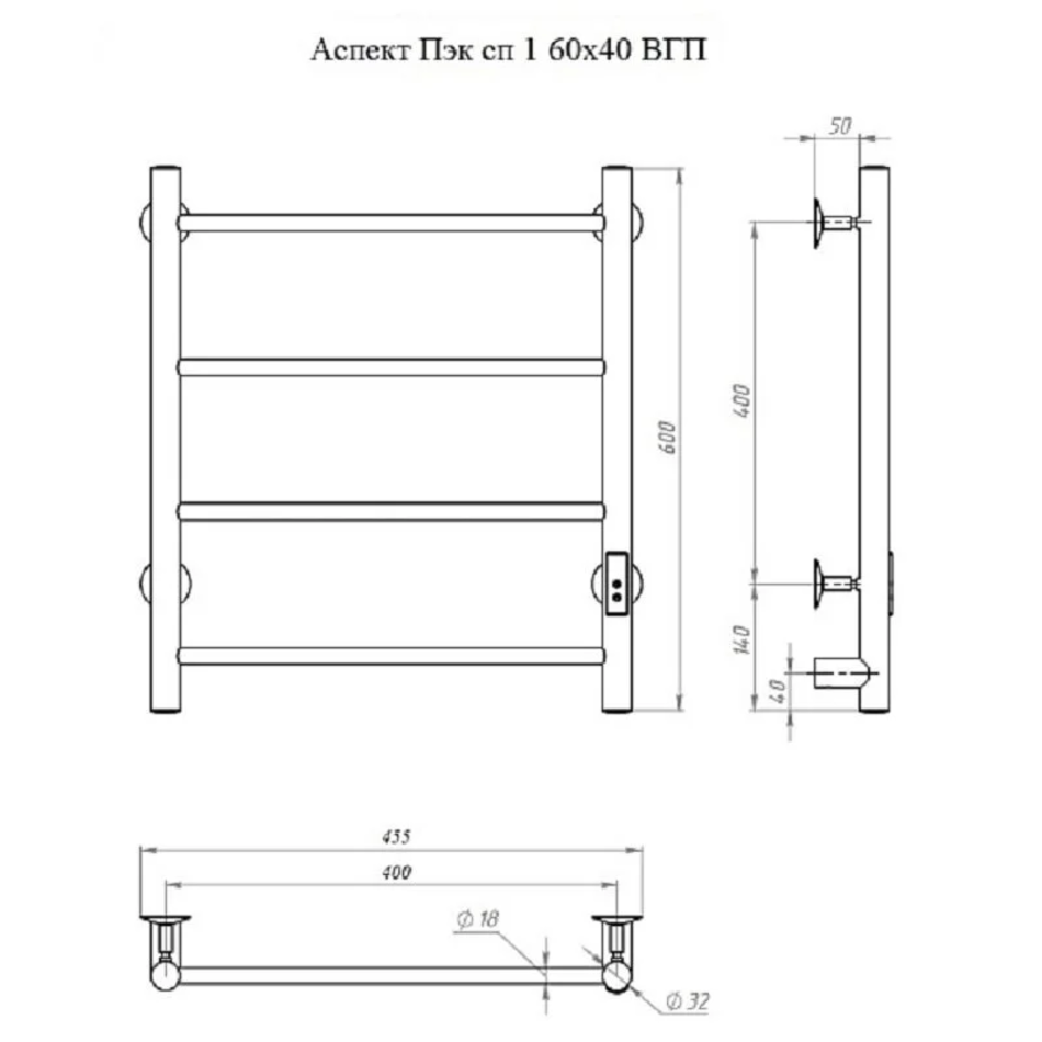 Полотенцесушитель электрический Тругор Аспект Пэк сп 1 60 х 40 графит ВГП, ширина 40 см, высота 60 см, АспектПэксп1/6040графВГП, диммер справа, цвет графит