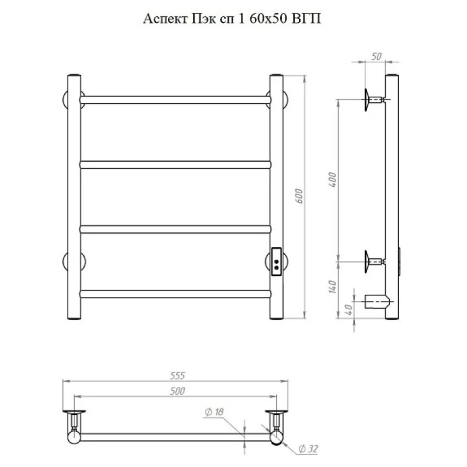 Полотенцесушитель электрический Тругор Аспект Пэк сп 1 60 х 50 графит ВГП, ширина 50 см, высота 60 см, АспектПэксп1/6050графВГП, диммер справа, цвет графит