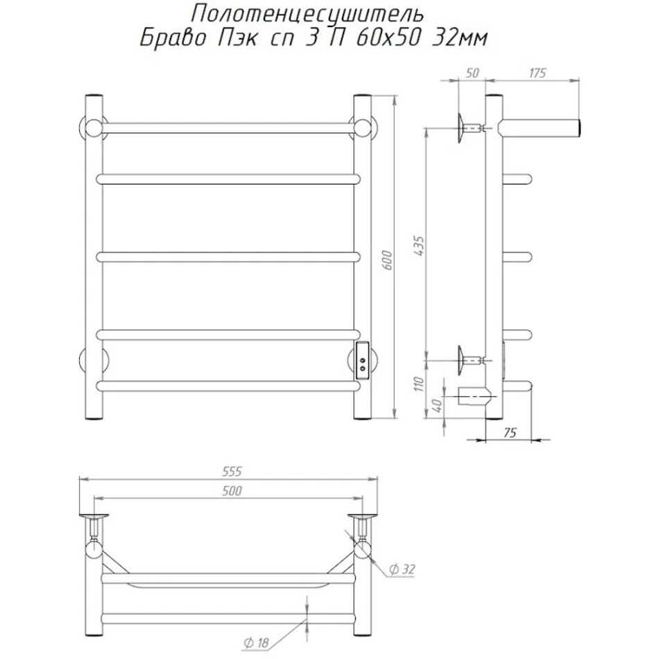 Полотенцесушитель электрический Тругор Браво Пэк сп серия 3, БравоПэксп3П/605032, ширина 50 см, высота 60 см, диммер справа, с полкой, хром