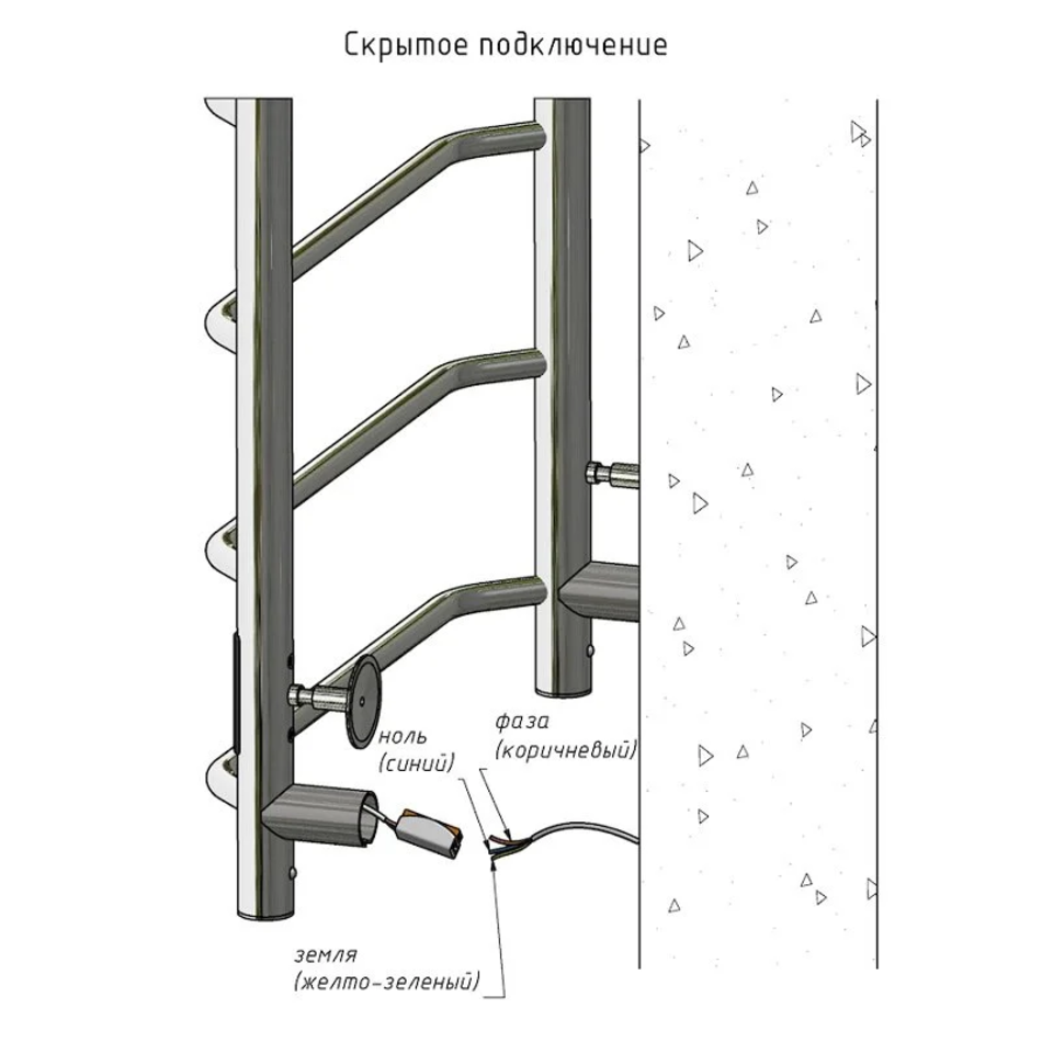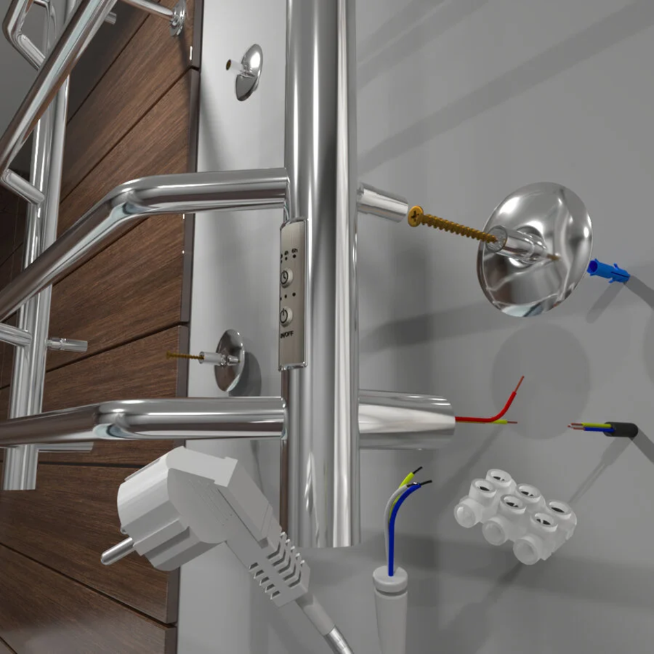 Для удобства ПЭК оснащен универсальным подключением. Полотенцесушитель можно подключить к сети питания, как справа, так и слева при помощи шнура с вилкой длиной 70 см и скрытым способом напрямую к проводке, заложенной в инженерную систему дома без использования штатного кабеля. Скрытый монтаж к электропитанию осуществляется через распаячные коробки, установленные справа и слева на коллекторе полотенцесушителя.