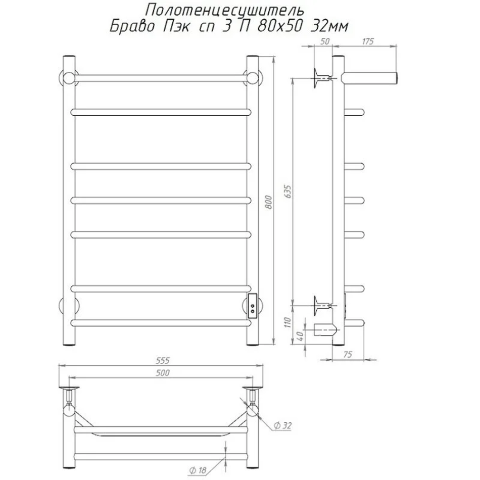 Полотенцесушитель электрический Тругор Браво Пэк сп серия 3, БравоПэксп3П/805032, ширина 50 см, высота 80 см, диммер справа, с полкой, хром