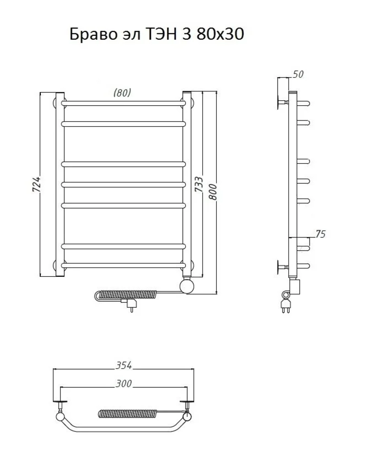 Полотенцесушитель электрический Тругор Браво эл ТЭН 3 80 x 30 (ЛЦ4), ширина 35.4 см, высота 80 см, хром