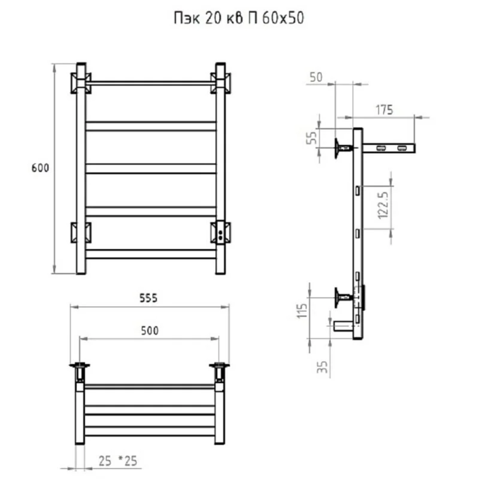 Полотенцесушитель электрический Тругор Пэк сп 20 кв П 60 х 50 графит ВГП, ширина 50 см, высота 60 см, ПЭКсп20квП/6050графВГП, диммер справа, цвет графит