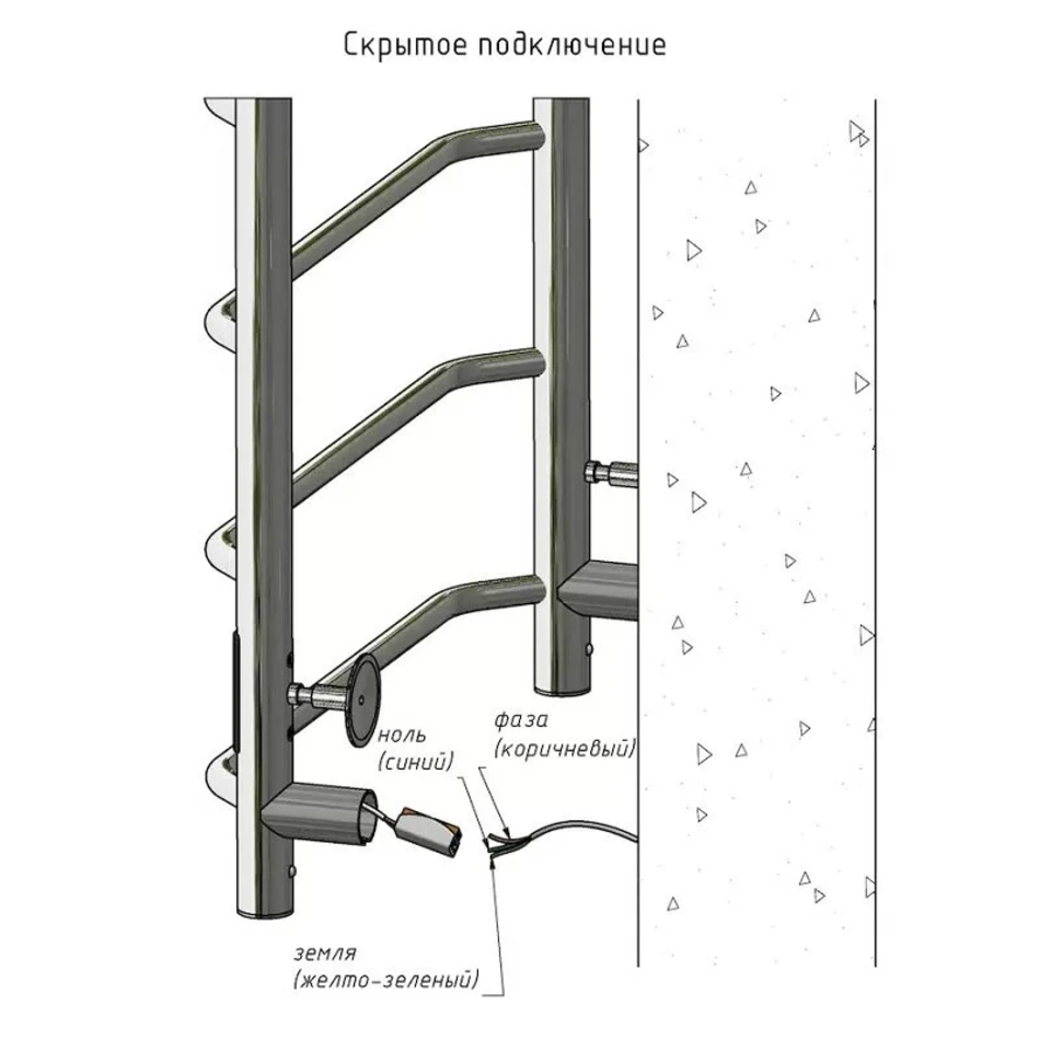 - Для удобства ПЭК оснащен универсальным подключением. Полотенцесушитель можно подключить к сети питания, как справа, так и слева при помощи шнура с вилкой длиной 70 см и скрытым способом напрямую к проводке, заложенной в инженерную систему дома без использования штатного кабеля. Скрытый монтаж к электропитанию осуществляется через распаячные коробки, установленные справа и слева на коллекторе полотенцесушителя.