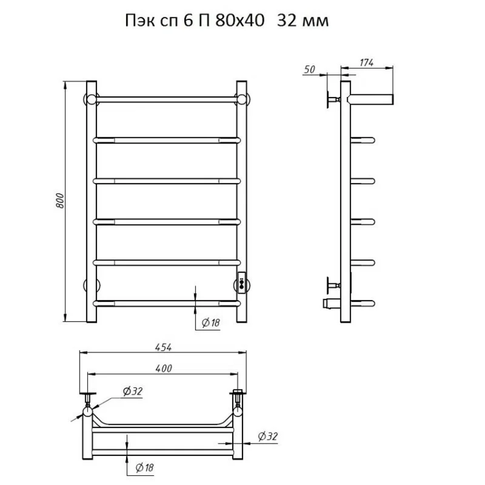 Полотенцесушитель электрический Тругор Пэк сп 6 П 80 х 40 черный ВГП, ширина 40 см, высота 80 см, Пэксп6П/8040черныйВГП, диммер справа, цвет черный