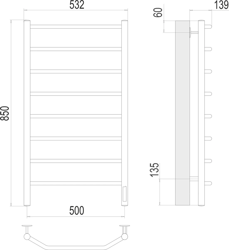 Полотенцесушитель электрический Виктория П8 500х850 Электро (quick touch), ширина 50 см, высота 85 см, диммер справа, 4670078531216