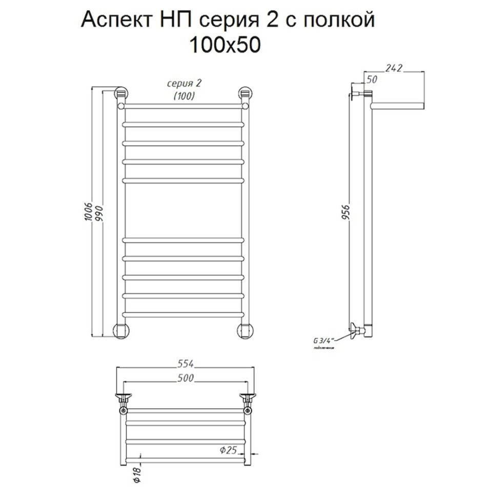 Полотенцесушитель Тругор Аспект НП 2 П 100*50 (ЛЦ6), ширина 50 см, высота 100 см, с полкой, хром