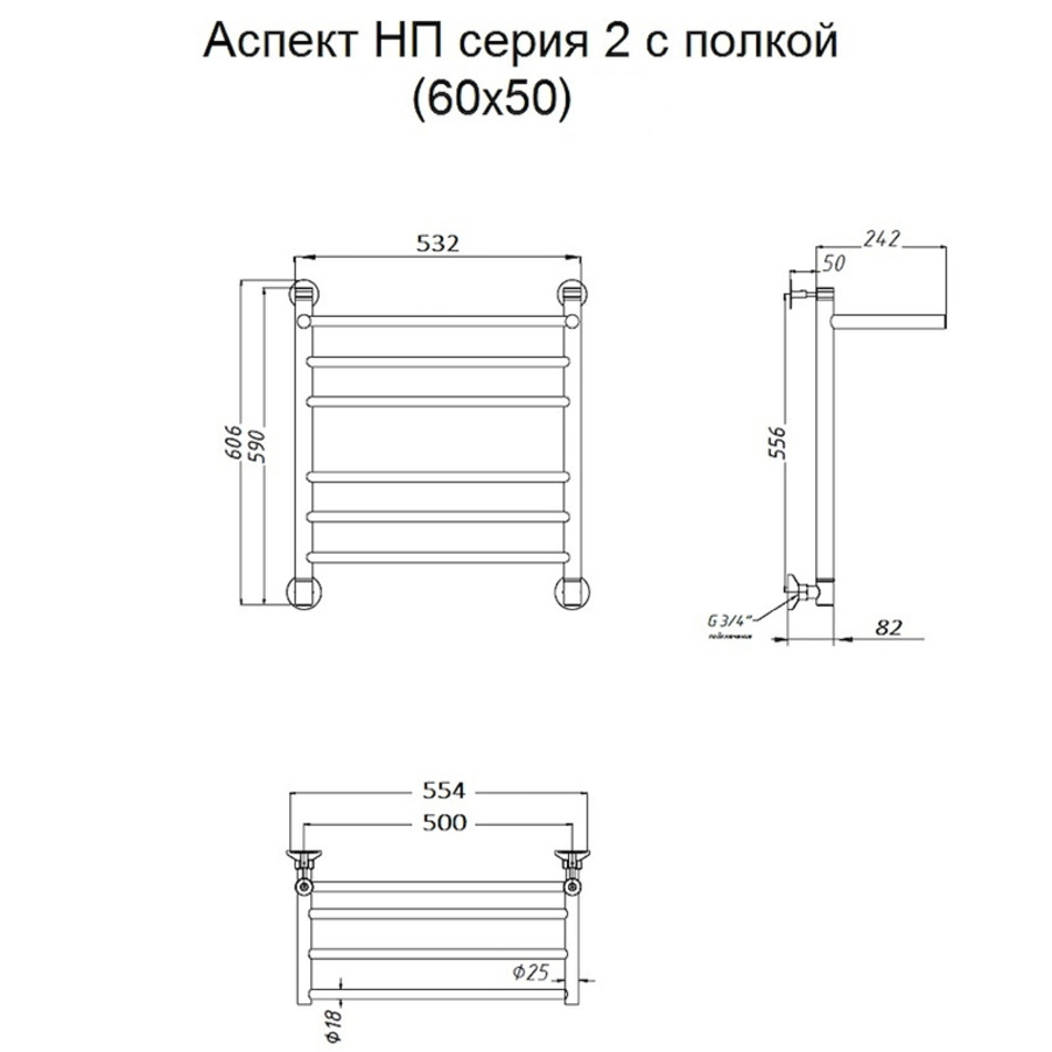 Полотенцесушитель Тругор Аспект НП 2 П 60*50 (ЛЦ6), ширина 50 см, высота 60 см, с полкой, хром
