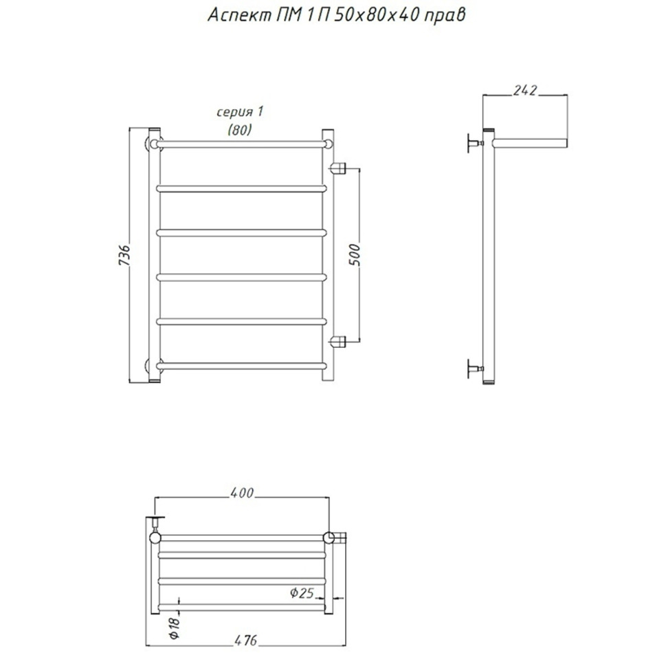 Полотенцесушитель Тругор Аспект ПМ 1 П 50*80*40 (ЛЦ6) правый, ширина 40 см, высота 80 см, боковое подключение 50 см, с полкой, хром