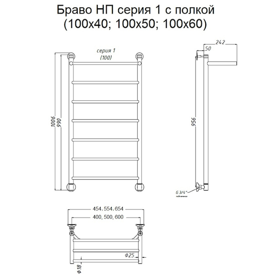 Полотенцесушитель Тругор Браво НП 1 П 100*40 (ЛЦ4), ширина 40 см, высота 100 см, с полкой, хром