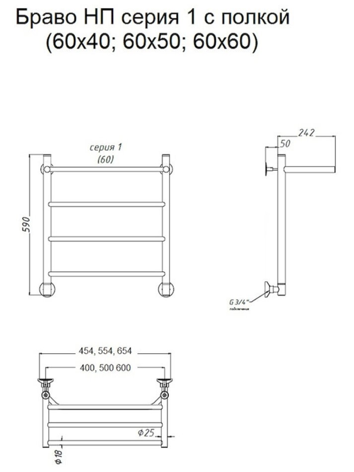 Полотенцесушитель Тругор Браво НП 1 П 60*50 (ЛЦ4), ширина 50 см, высота 60 см, с полкой, хром