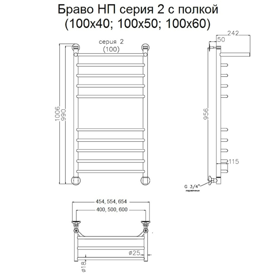 Полотенцесушитель Тругор Браво НП 2 П 100*50 (ЛЦ4), ширина 50 см, высота 100 см, с полкой, хром