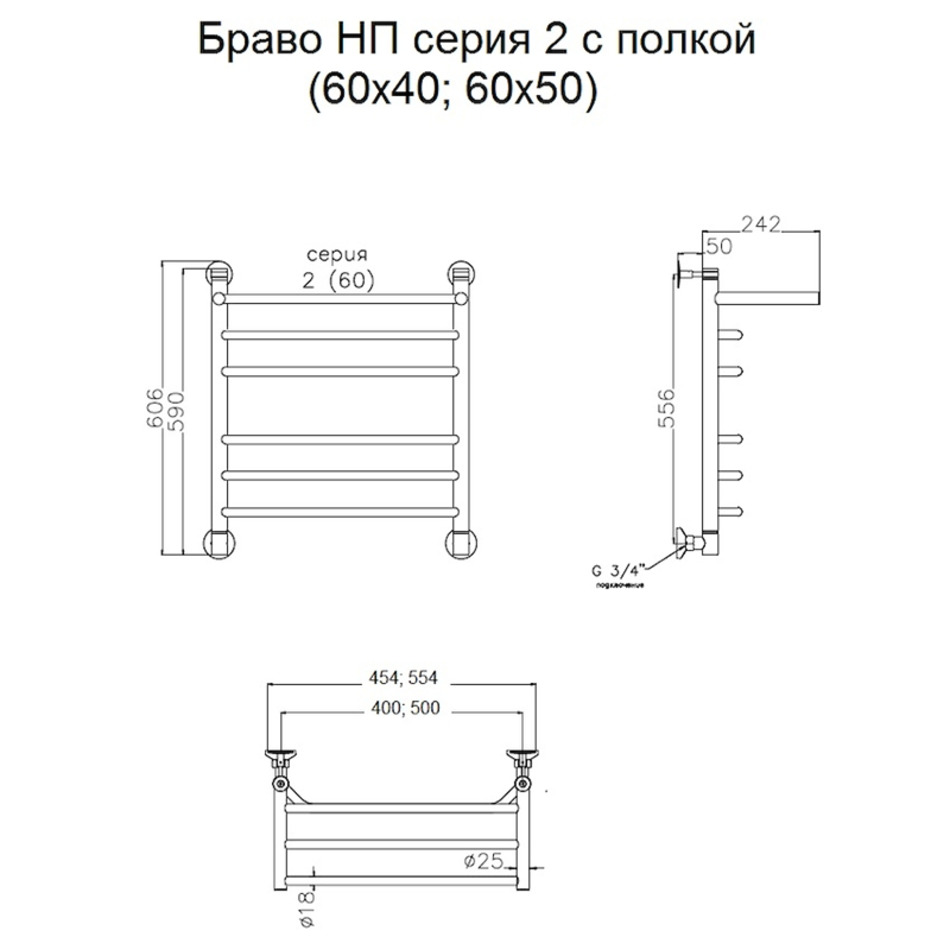 Полотенцесушитель Тругор Браво НП 2 П 60*40 (ЛЦ4), ширина 40 см, высота 60 см, с полкой, хром