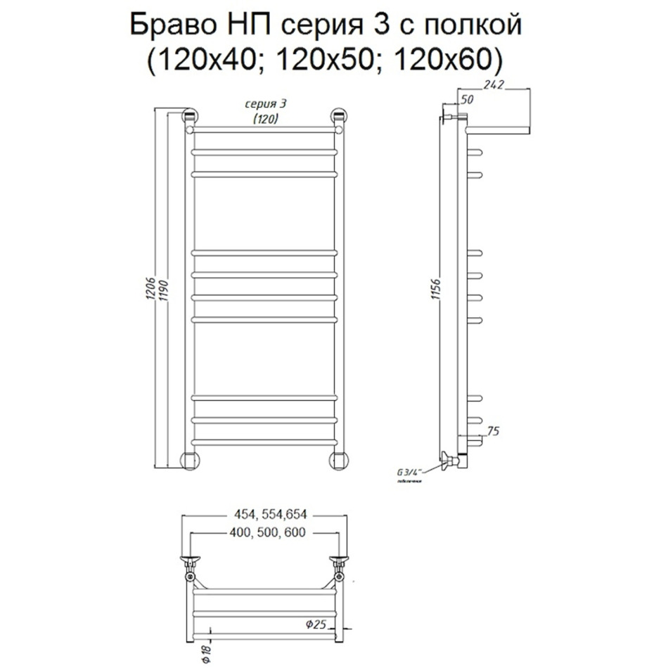 Полотенцесушитель Тругор Браво НП 3 П 120*40 (ЛЦ4), ширина 40 см, высота 120 см, с полкой, хром
