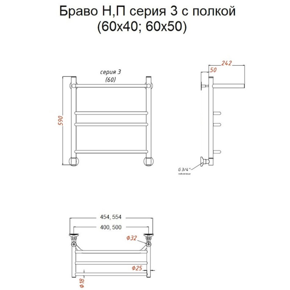 Полотенцесушитель Тругор Браво НП 3 П 60*50 (ЛЦ4), ширина 50 см, высота 60 см, с полкой, хром