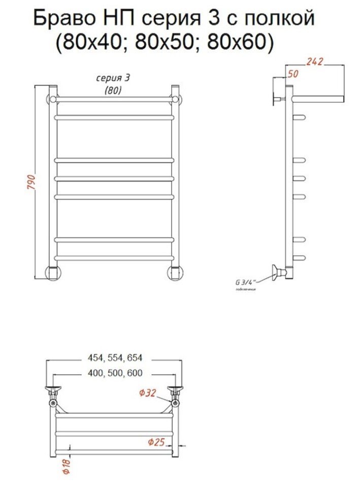 Полотенцесушитель Тругор Браво НП 3 П 80*60 (ЛЦ4), ширина 60 см, высота 80 см, с полкой, хром