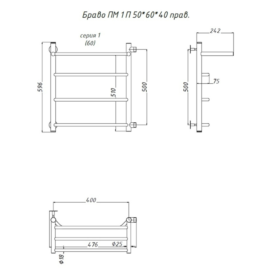 Полотенцесушитель Тругор Браво ПМ 1 П 50*60*40 (ЛЦ4) правый, ширина 40 см, высота 60 см, боковое подключение 50 см, с полкой, хром