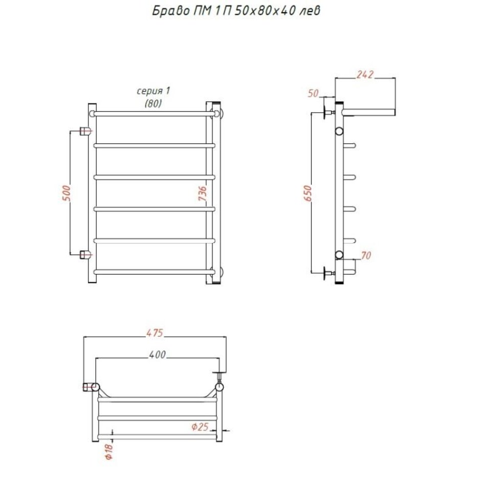Полотенцесушитель Тругор Браво ПМ 1 П левый, ширина 47.5 см, высота 73.6 см, боковое подключение 50 см, с полкой, хром
