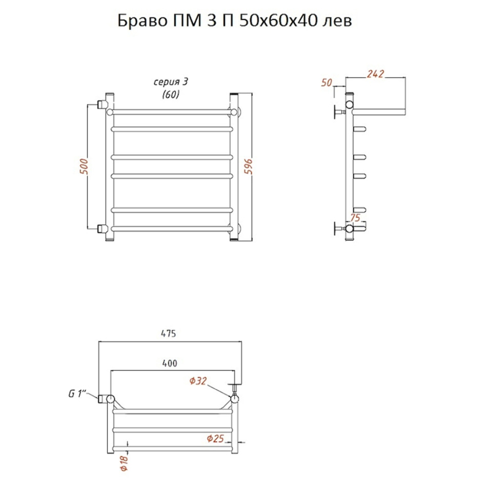 Полотенцесушитель Тругор Браво ПМ 3 П 50*60*40 (ЛЦ4) левый, ширина 40 см, высота 60 см, боковое подключение 50 см, с полкой, хром