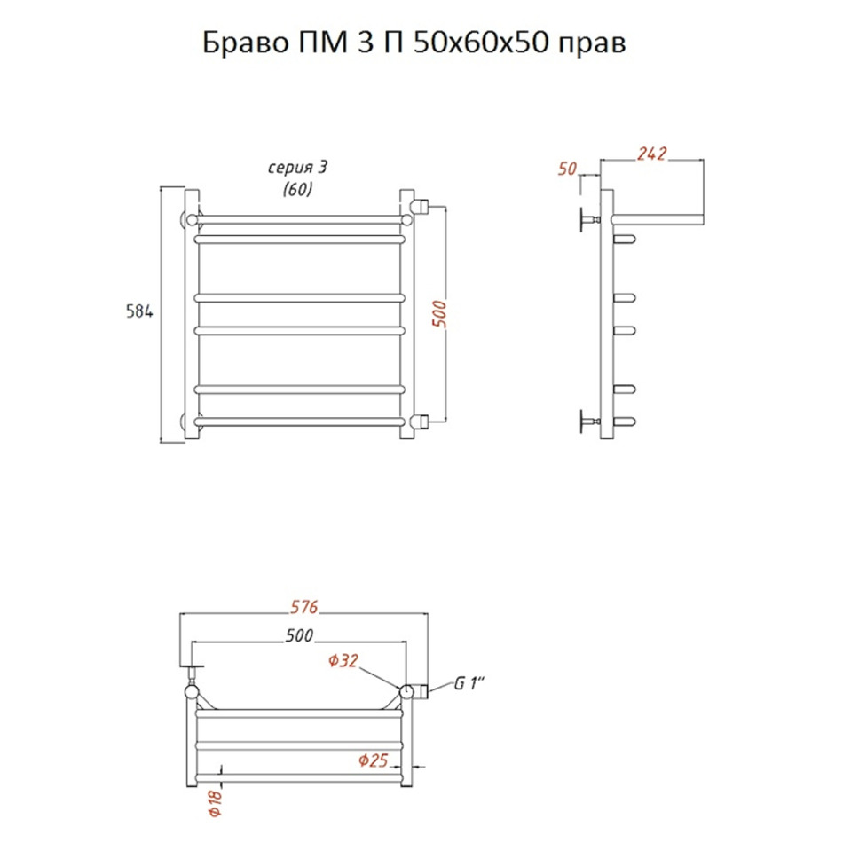 Полотенцесушитель Тругор Браво ПМ 3 П 50*60*50 (ЛЦ4) правый, ширина 50 см, высота 60 см, боковое подключение 50 см, с полкой, хром