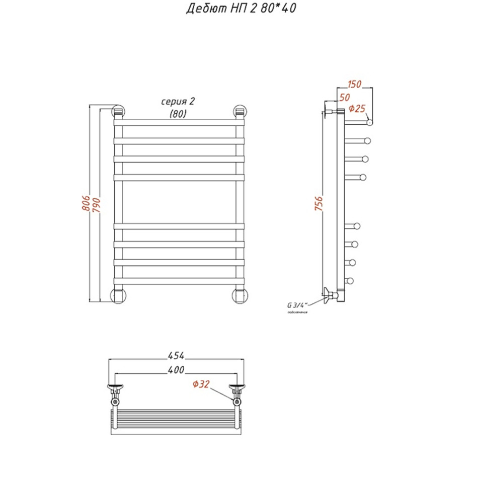 Полотенцесушитель Тругор Дебют НП 2 80*40 (ЛЦ23), ширина 40 см, высота 80 см, хром