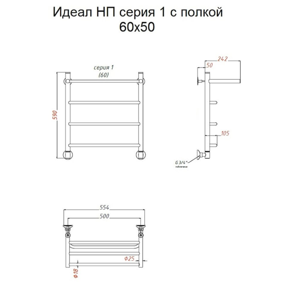 Полотенцесушитель Тругор Идеал НП 1 П 60*50 (ЛЦ5), ширина 50 см, высота 60 см, с полкой, хром