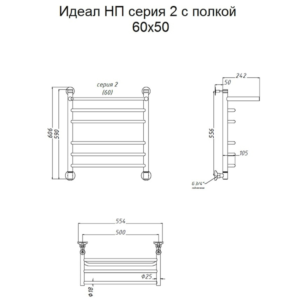 Полотенцесушитель Тругор Идеал НП 2 П 60*50 (ЛЦ5), ширина 50 см, высота 60 см, с полкой, хром