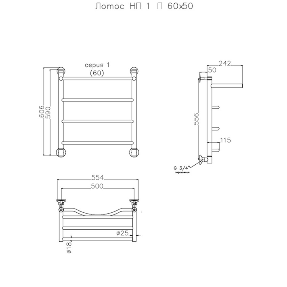 Полотенцесушитель Тругор Лотос НП 1 П 60*50 (ЛЦ28), ширина 50 см, высота 60 см, с полкой, хром