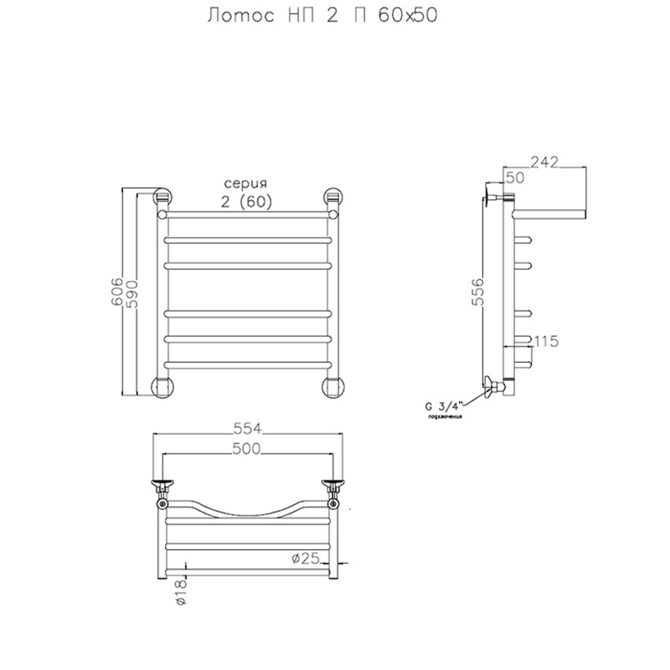 Полотенцесушитель Тругор Лотос НП 2 П 60*50 (ЛЦ28), ширина 50 см, высота 60 см, с полкой, хром