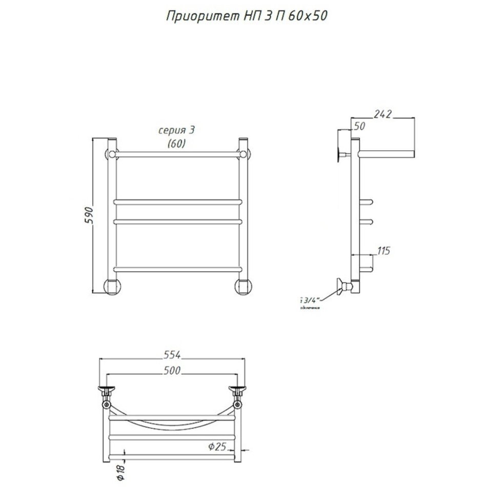 Полотенцесушитель Тругор Приоритет НП 3 П 60*50 (ЛЦ2), ширина 50 см, высота 60 см, с полкой, хром