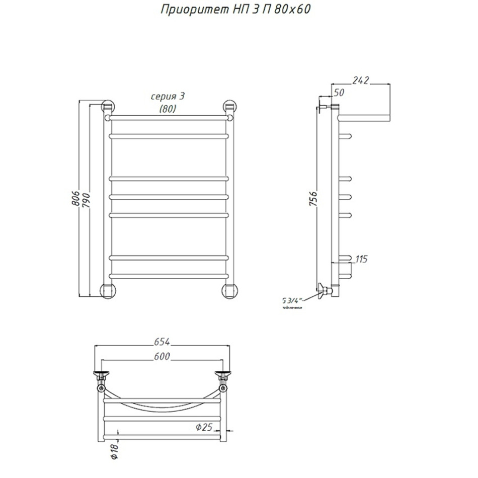 Полотенцесушитель Тругор Приоритет НП 3 П 80*60 (ЛЦ2), ширина 60 см, высота 80 см, с полкой, хром