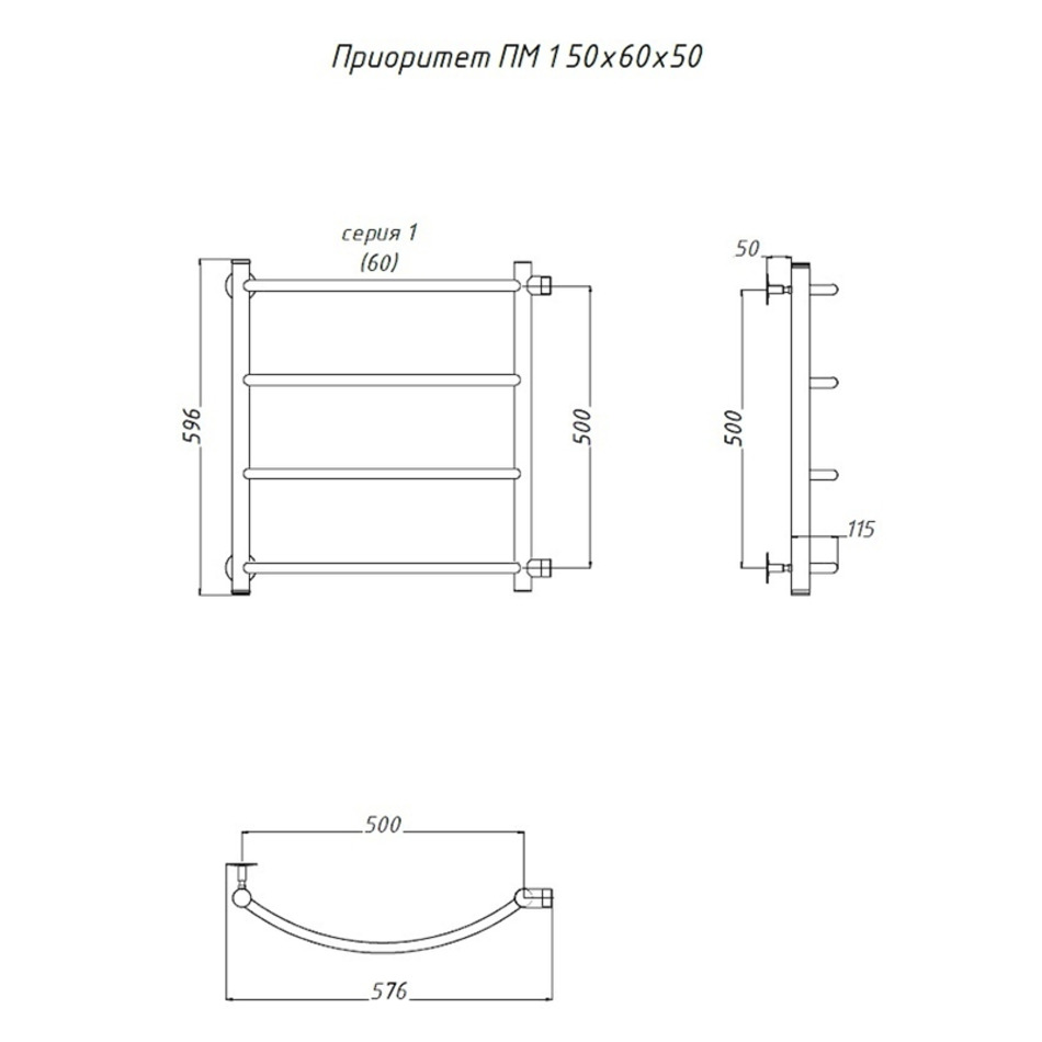 Полотенцесушитель Тругор Приоритет ПМ 1 50*60*50 (ЛЦ2), ширина 60 см, высота 50 см, боковое подключение 50 см, хром
