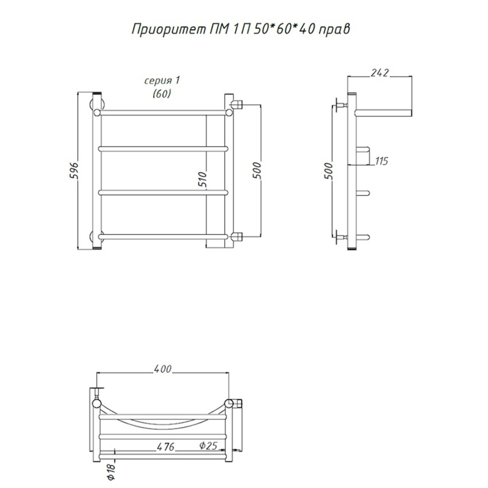 Полотенцесушитель Тругор Приоритет ПМ 1 П 50*60*40 (ЛЦ2) ПРАВЫЙ, ширина 40 см, высота 60 см, боковое подключение 50 см, с полкой, хром