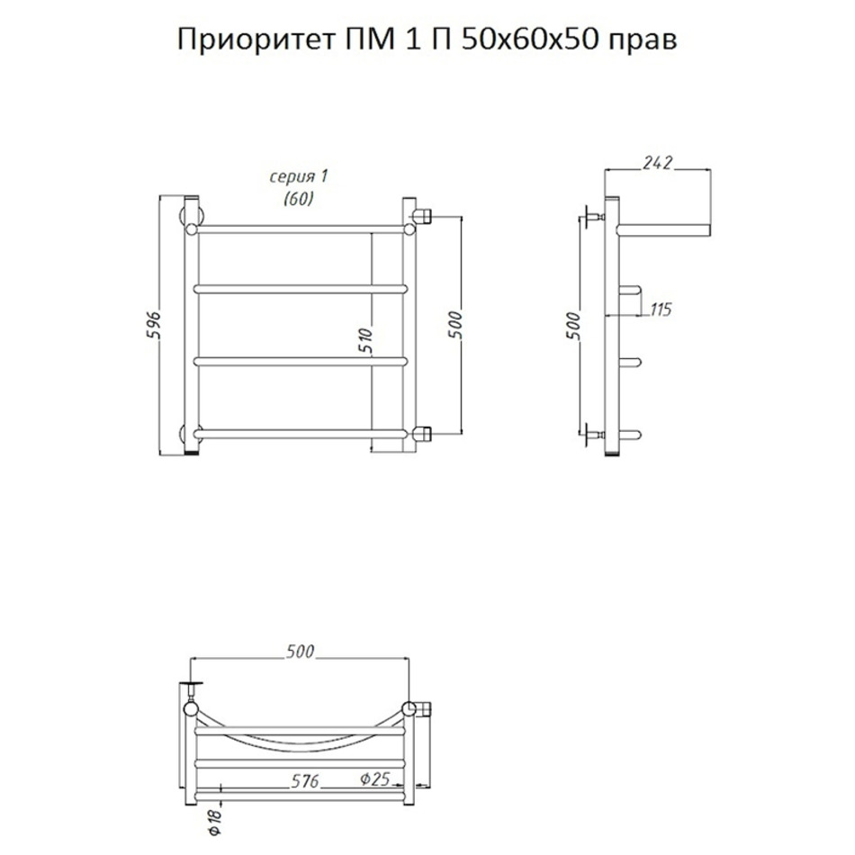 Полотенцесушитель Тругор Приоритет ПМ 1 П 50*60*50 (ЛЦ2) ПРАВЫЙ, ширина 50 см, высота 60 см, боковое подключение 50 см, с полкой, хром