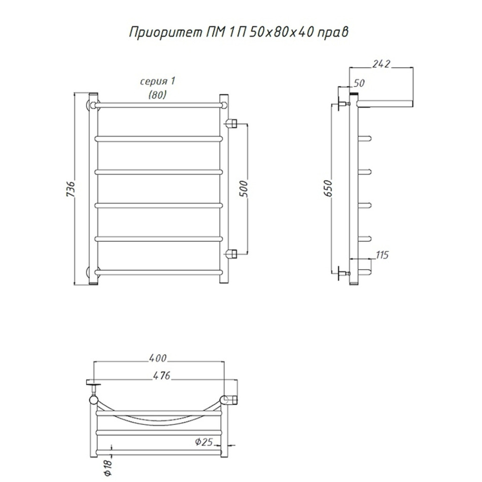 Полотенцесушитель Тругор Приоритет ПМ 1 П 50*80*40 (ЛЦ2) ПРАВЫЙ, ширина 40 см, высота 80 см, боковое подключение 50 см, с полкой, хром