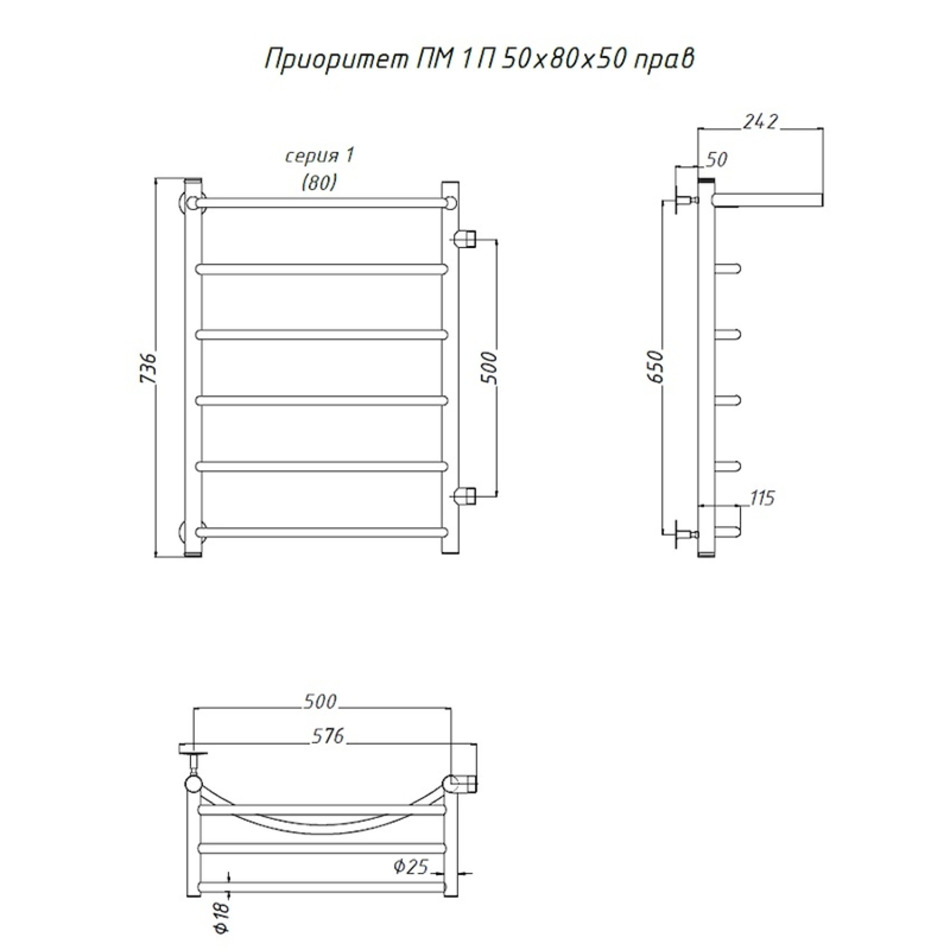 Полотенцесушитель Тругор Приоритет ПМ 1 П 50*80*50 (ЛЦ2) ПРАВЫЙ, ширина 50 см, высота 80 см, боковое подключение 50 см, с полкой, хром