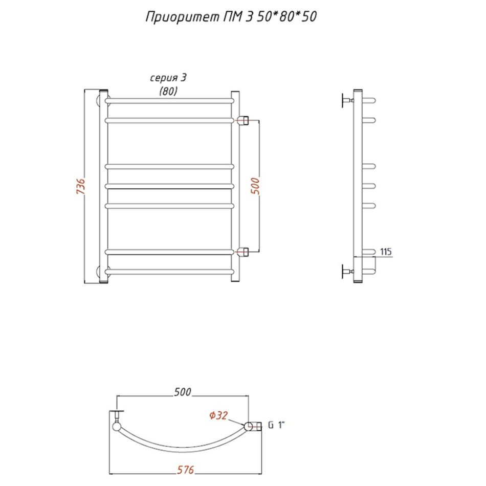 Полотенцесушитель Тругор Приоритет ПМ 3 50*80*50 (ЛЦ2), ширина 50 см, высота 80 см, боковое подключение 50 см, хром