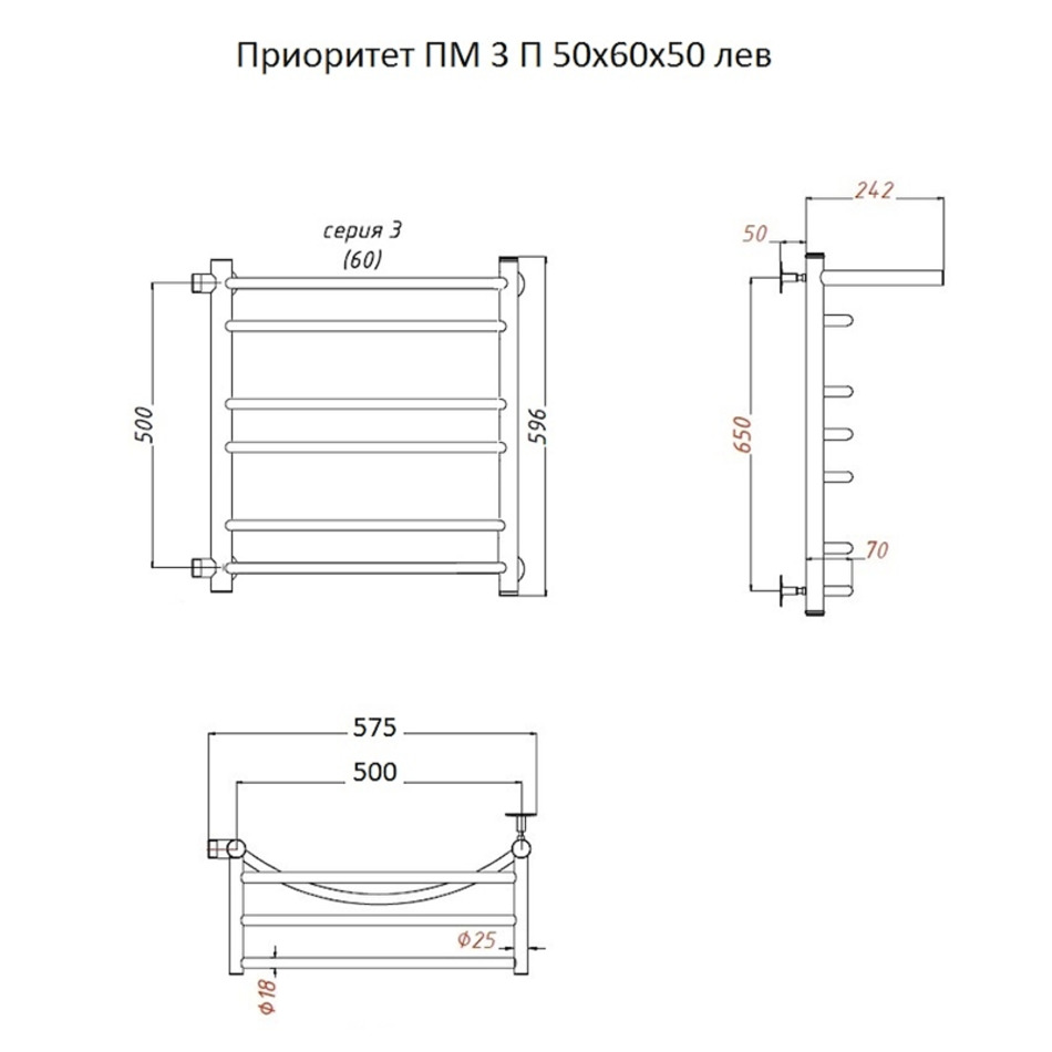 Полотенцесушитель Тругор Приоритет ПМ 3 П 50*60*50 (ЛЦ2) левый, ширина 50 см, высота 60 см, боковое подключение 50 см, с полкой, хром